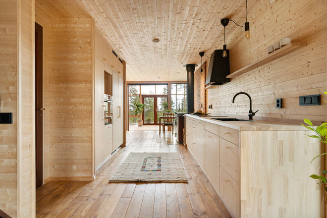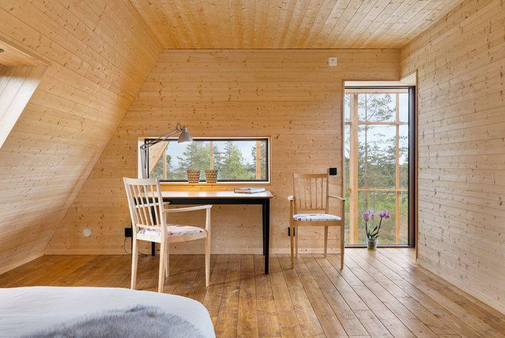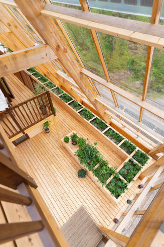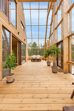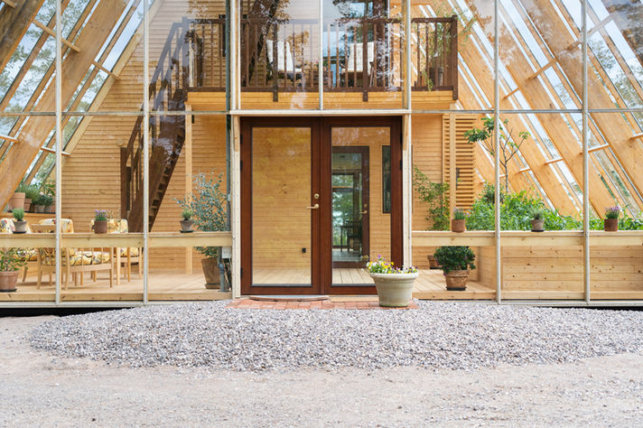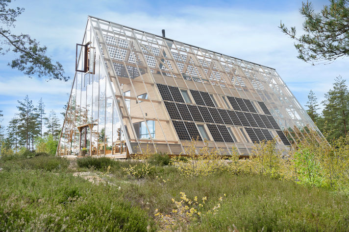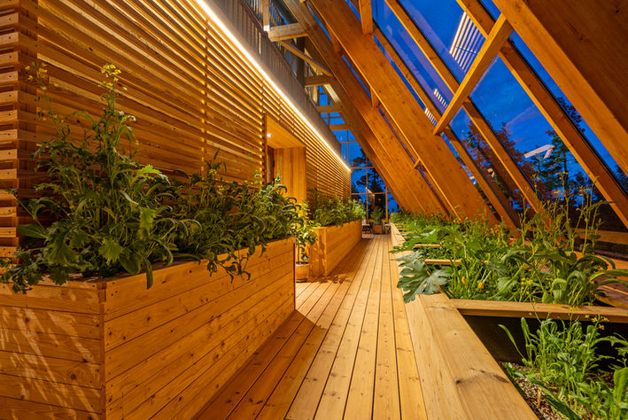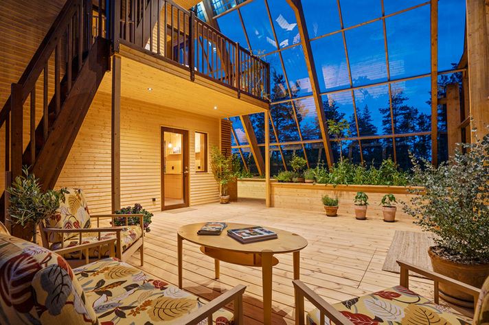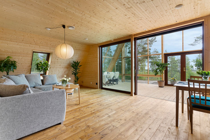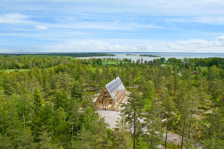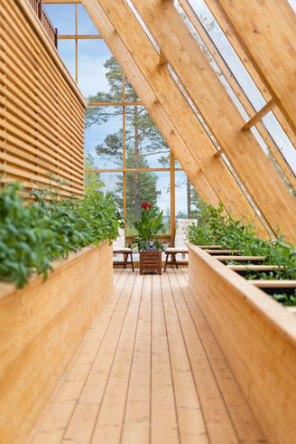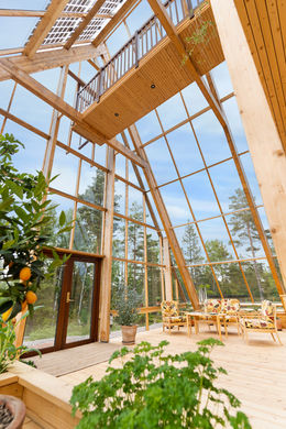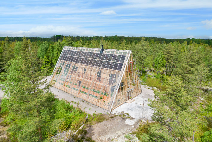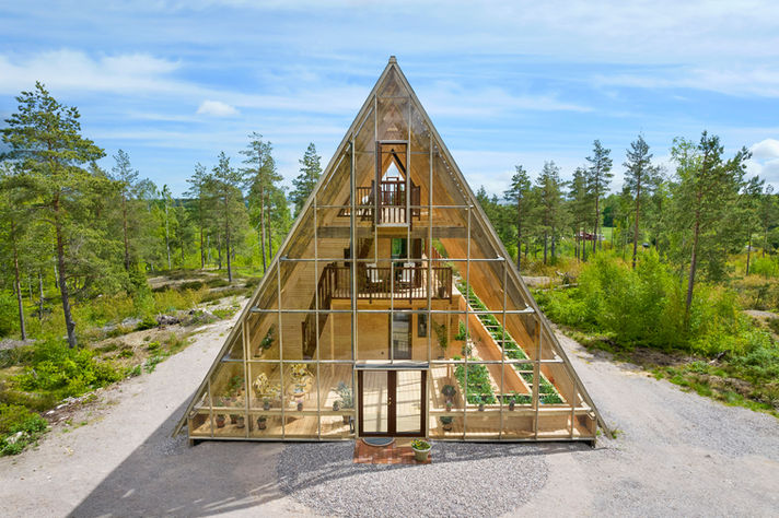 Atri is an A‑shaped, self‑sufficient residential building designed to achieve minimal environmental impact and an integrated interaction between living, technology, and cultivation. The house was designed and built by the housing company Naturvillan in close design collaboration with Greenhouse Living. Constructed of wood and glass, it unites greenhouse and living spaces in a bright and cohesive architectural structure. The pointed geometry and the pine tones of the surrounding forest are reflected in the building’s striking exterior, where two soaring glass walls lean toward one another, revealing an interior almost entirely composed of timber.